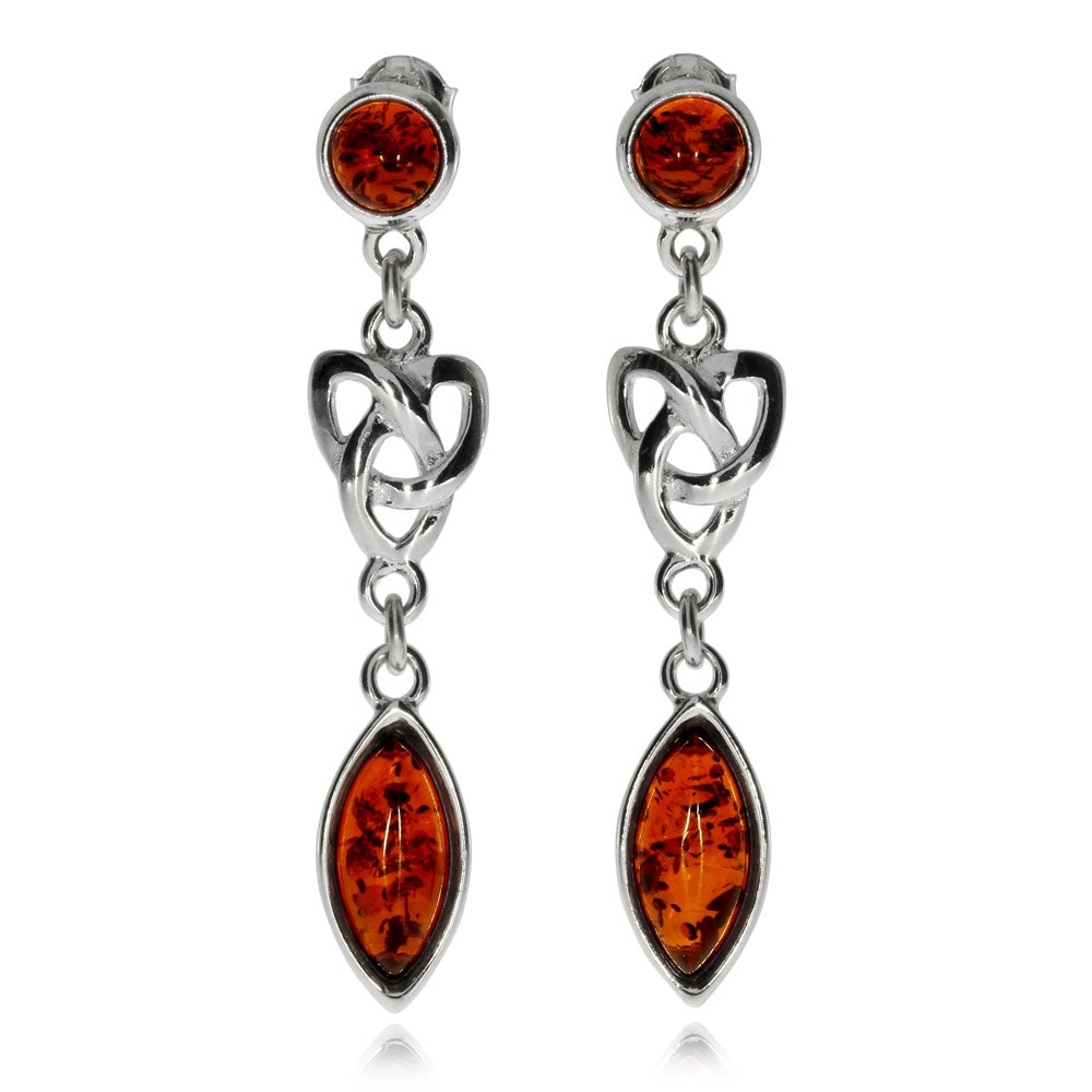 Krásné dámské náušnice, které v sobě spojují jemnost a netradiční půvab. Náušnice jsou vyrobené ze zářivého stříbra a tvoří je kulatý jantar v kovové linii, od kterého se vine řetízek s trojcípou ozdobou, který zakončuje opět jantar, tentokrát ve tvaru markýzy s jemnou stříbrnou obvodovou linií.
