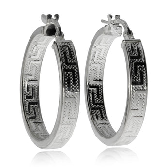 Stříbrné dámské náušnice kruhy patří k oblíbeným typům šperků. I přesto, že jsou výrazné, mohou působit jemně a umírněně. Tyto originálně zpracované dámské kruhy nesou po obvodu decentní zdobení v podobě řeckého motivu.
