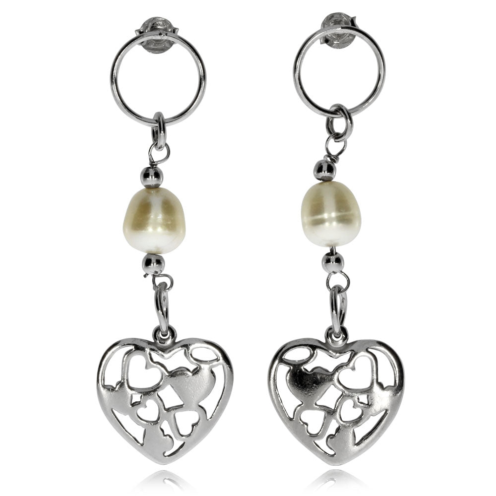 Krásné dámské náušnice, které v sobě spojují nápadité a elegantní zpracování a jemný půvab. Náušnice jsou vyrobené ze stříbra s rhodiovaným povrchem, který se používá pro svou dobrou odolnost a lesk. Nesou nápaditě zpracovanou srdcovou ozdobu a říční perlu.