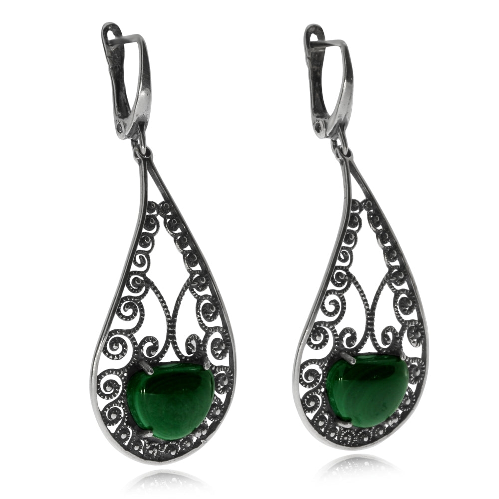 Okouzlující a bohatě zdobené dámské náušnice, které se skvěle hodí pro ženy, které vědí, co chtějí a nebojí se nápadně ozdobit. Náušnice jsou vyrobené ze starostříbra, které působí starobyle a dává vyniknout i drobným detailům motivu. V každé náušnici je potom zasazený zelenkavý malachit, který dodává šperkům osobitost a originalitu.