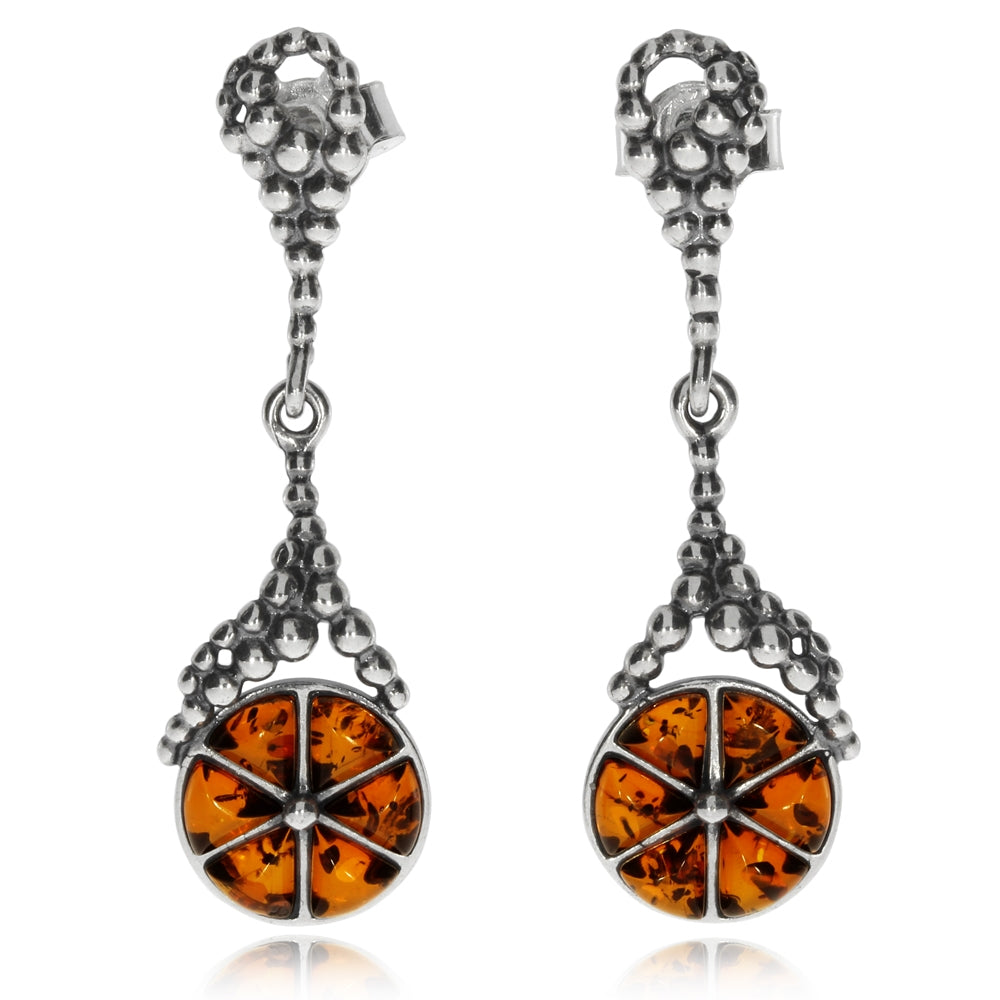 Okouzlující dámské náušnice, které zaujmou svou jemnou zdobností a nápadným půvabem. Náušnice jsou vyrobené ze stříbra se starostříbrnou úpravou povrchu. Ta dává dobře vyniknout jemné linii složené z malých zdobných kuliček, která nese kruhovou ozdobu vytvořenou šesti kousky zlatavého jantaru.