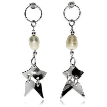 Stříbrné visací náušnice s říční perlou a dvěma kovovými ozdobami