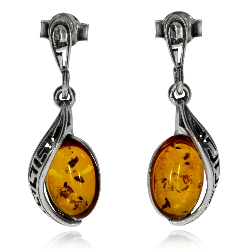 Nádherné dámské visací náušnice, které v sobě spojují hned několik oblíbených šperkových prvků. Ústředním prvkem celého designu je oválně opracovaný kousek jantaru, který je zasazený do stříbrné linie. Ta je ozdobená drobným řeckým vzorem. Starobylá starostříbrná úprava potom dává těmto znakům vyniknout a dodává šperkům historický ráz.