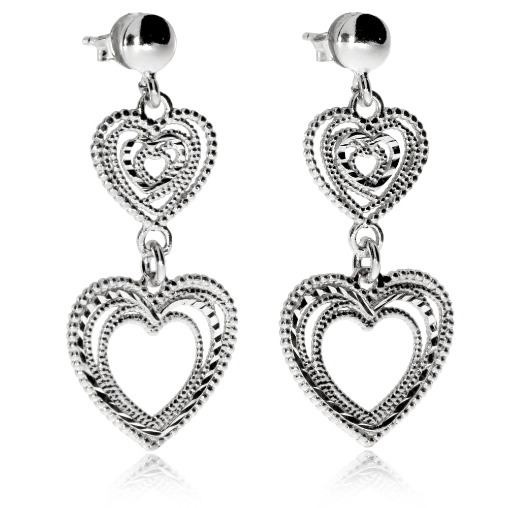 Delší visací náušnice se zapínáním na puzetu se skládají ze dvou nad sebou zavěšených srdíček. Jemné vroubkování rhodiovaného stříbra vytváří velmi zajímavý efekt. Náušnice působí velmi vzdušným dojmem a jsou i lehké, tedy příjemné na nošení.