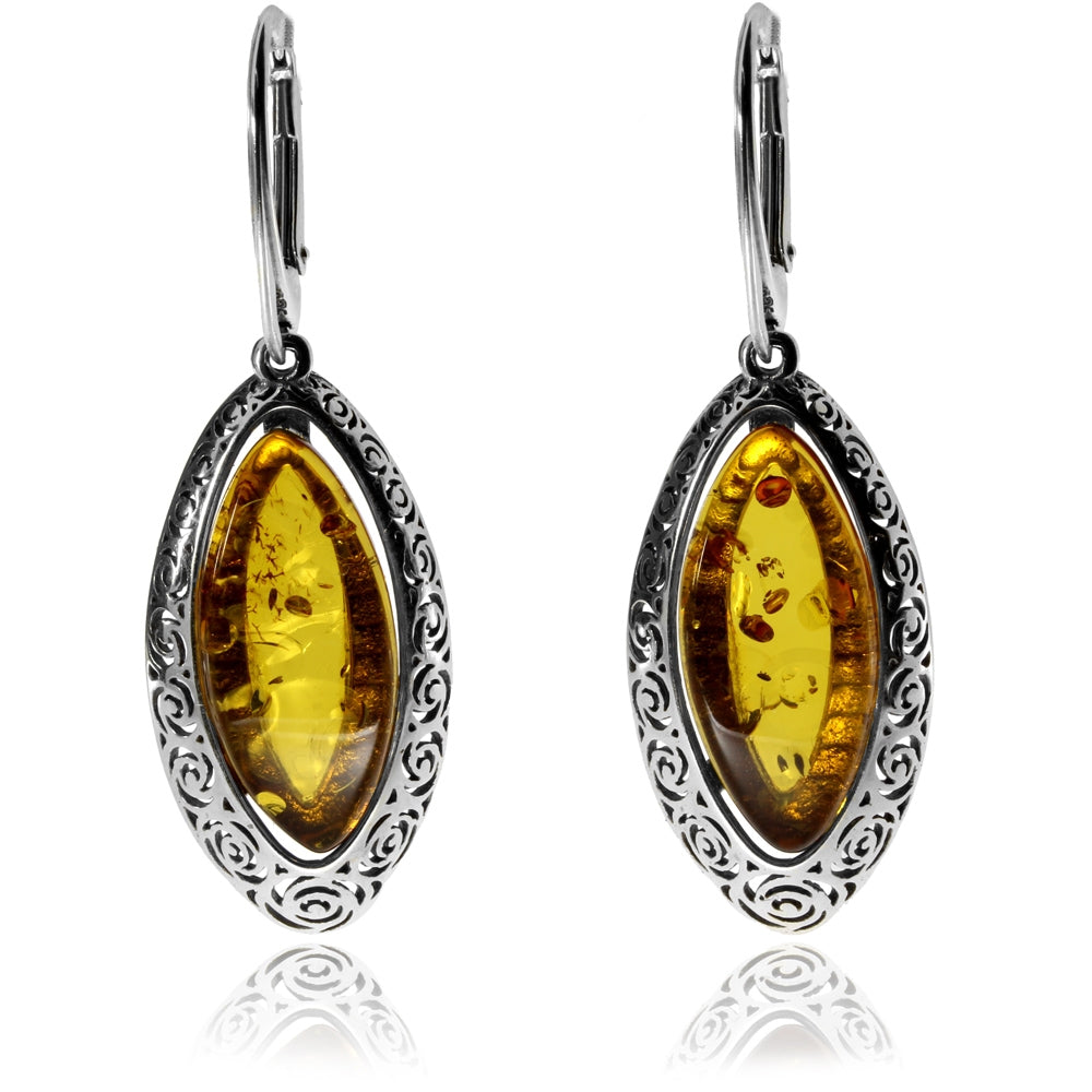 Stříbrné visací náušnice s jantarem - Ozdobené ovály