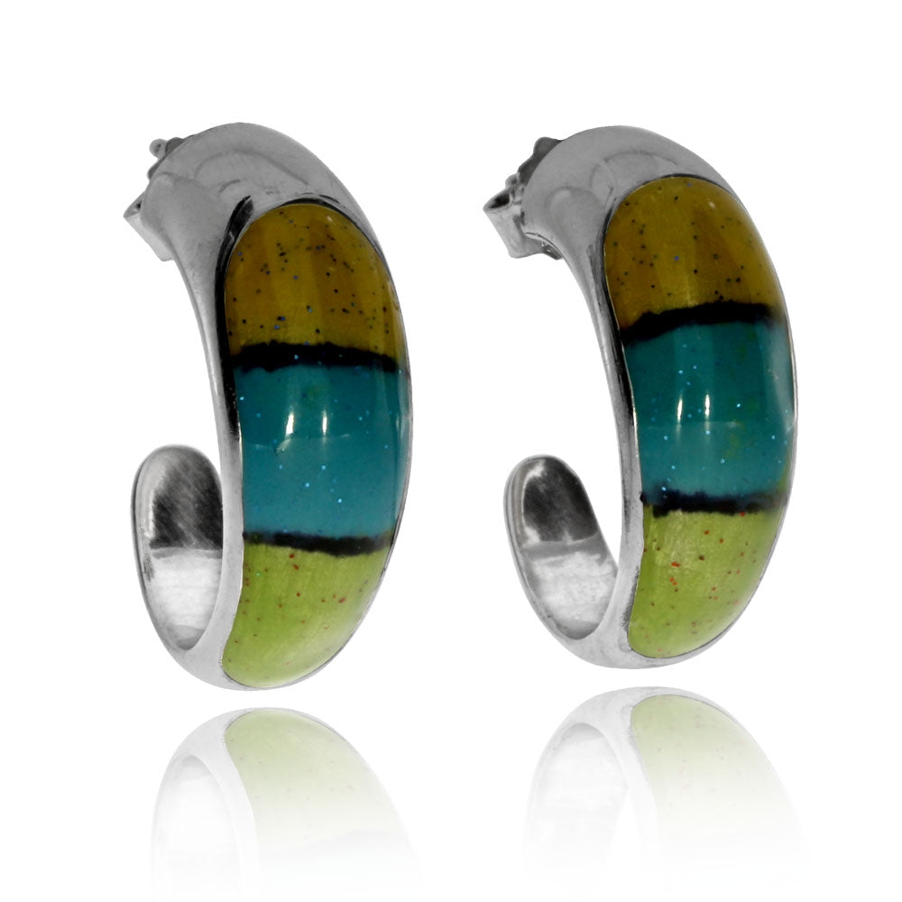 Originálně zpracované dámské náušnice, které upoutají pozornost svým osobitým zpracováním a hravým designem. Náušnice ve tvaru půlkruhu jsou vyrobené ze stříbra s vrstvou odolného a pěkně lesklého rhodia. Jejich přední část je potom ozdobená třemi barevnými plochami.