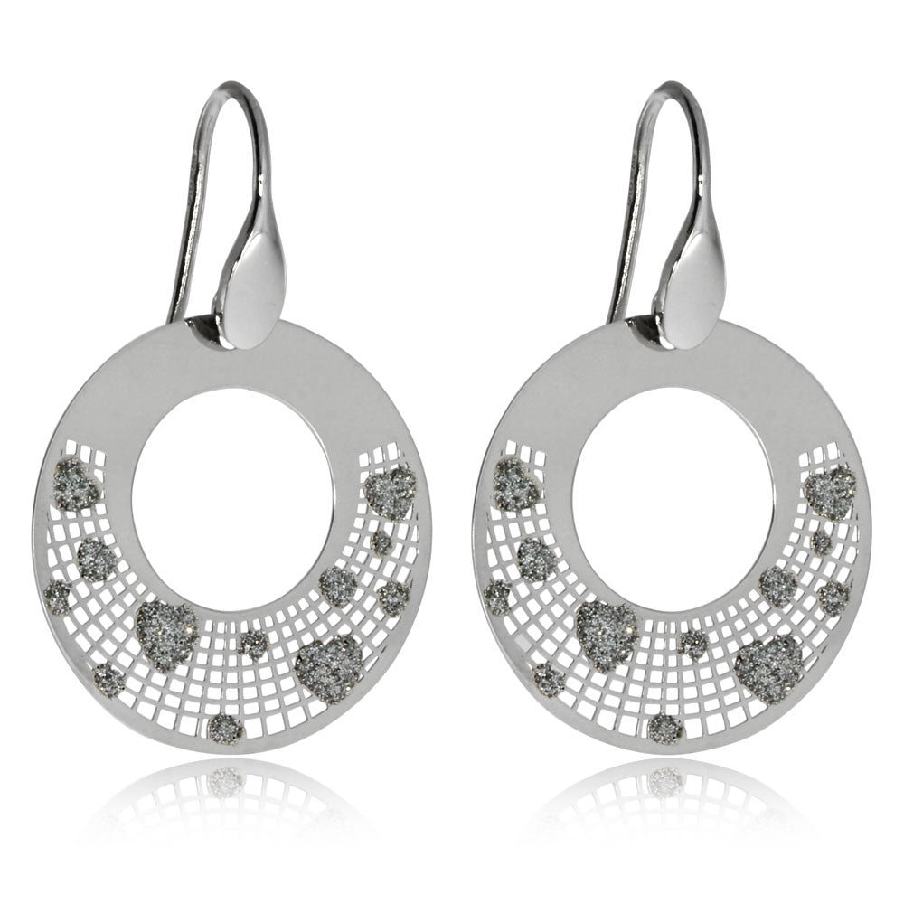 Stříbrné rhodiované náušnice jsou vyrobené velmi pokročilou technologií, kdy je za pomoci laseru vytvořena velmi jemná síťka. Na tuto síťku je aplikována speciální třpytivá fólie ve tvaru srdíček. Ačkoliv jsou náušnice poměrně velké, nejsou těžké a budou proto pohodlné. Vysoký lesk náušnic a navíc třpytivá srdíčka tvoří výrazný dojem. Náušnice jsou tedy vhodné pro ženy, které chtějí mít výrazné šperky.