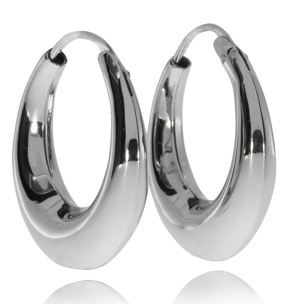 Pěkně zpracované dámské náušnice, které se skvěle hodí pro každou příležitost. Širší kruhy střední velikosti zaujmou svým jednoduchým a uhlazeným designem a krásně lesklou stříbrnou plochou, kterou zajišťuje povrchová vrstva odolného rhodia.
