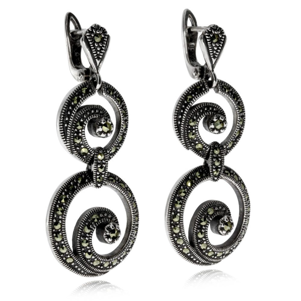 Stříbrné visací náušnice s markazitem, dvě ozdobné spirály