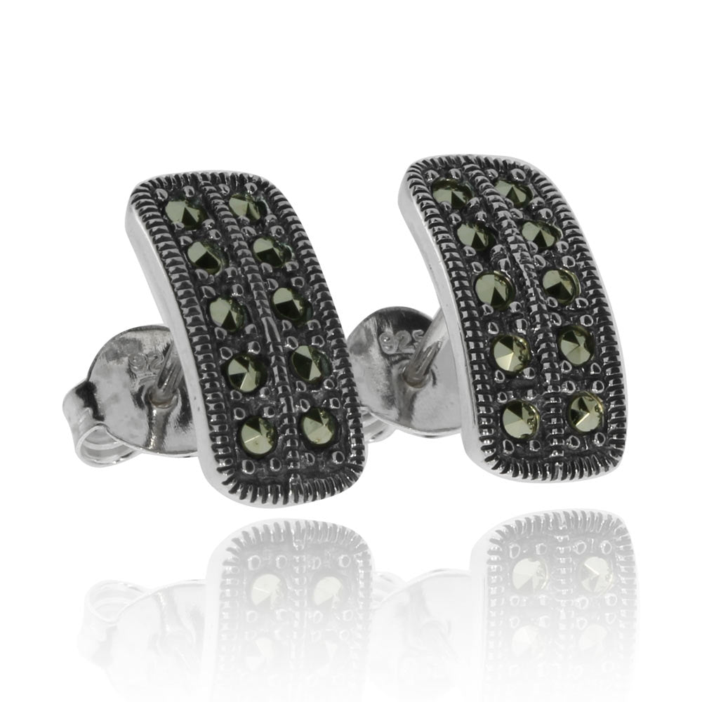 Jednoduše zpracované a zdobné náušnice plné jemného půvabu se skvěle hodí pro ženy se zálibou v netradičních a nekomplikovaných špercích. Ve dvou řadách jsou osázené třpytivými markazity, vzácnými kameny s kovovým leskem. Starostříbrná úprava potom dodává náušnicím osobitý vzhled.