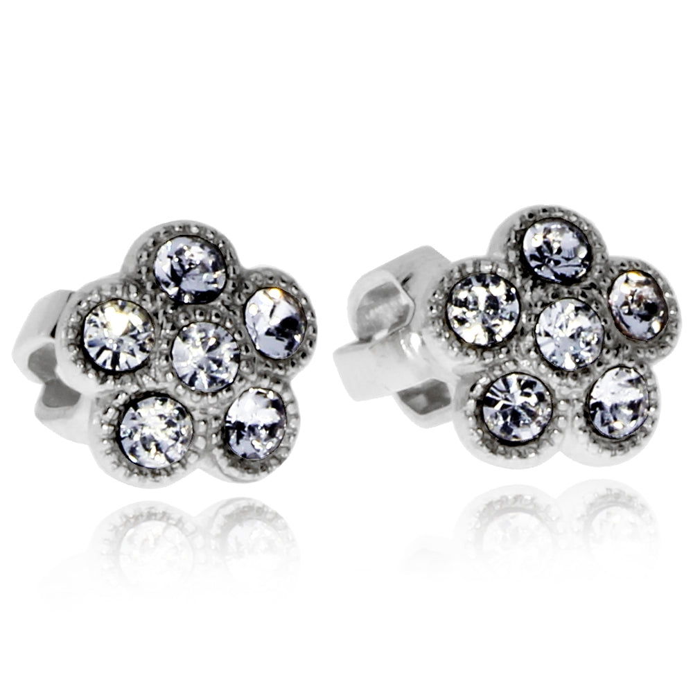 Velice jednoduché a krásně zpracované dětské bodové náušnice jsou vyrobené ze stříbra s rhodiovaným povrchem. Ten je dobře odolný proti poškození a také pěkně lesklý. Náušnice nesou jednoduchý květinový motiv, květ je tvořen šesti čirými kulatými křišťály. Zapínání náušnic je pomocí šroubku.