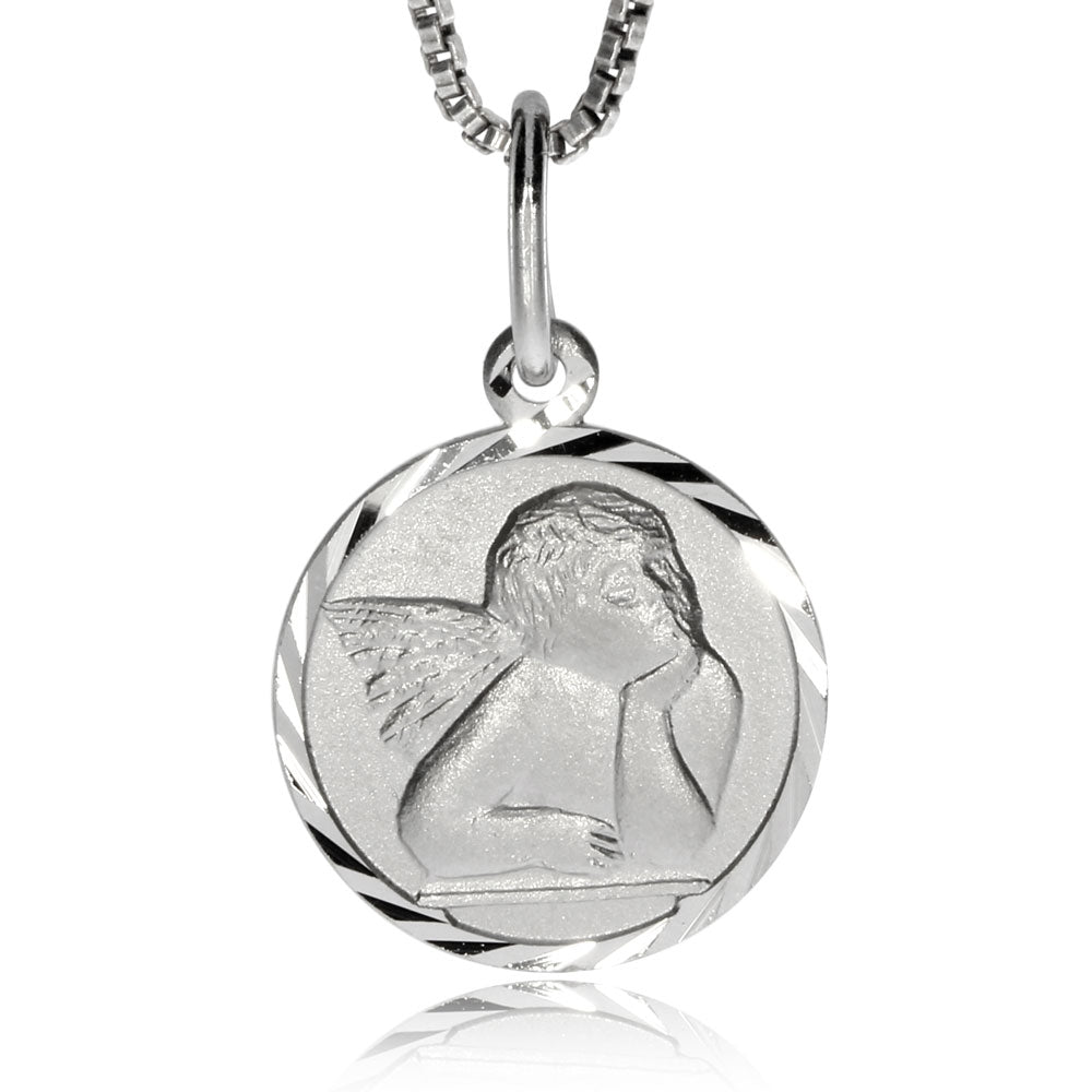 Stříbrný rhodiovaný přívěsek kulatého tvaru se zobrazením andělíčka. Přívěsek má jemně broušenou obrubu a jednoduchý kulatý úchyt. Průměr přívěsku je přibližně 1,5 mm a je proto vhodný i pro děti.
