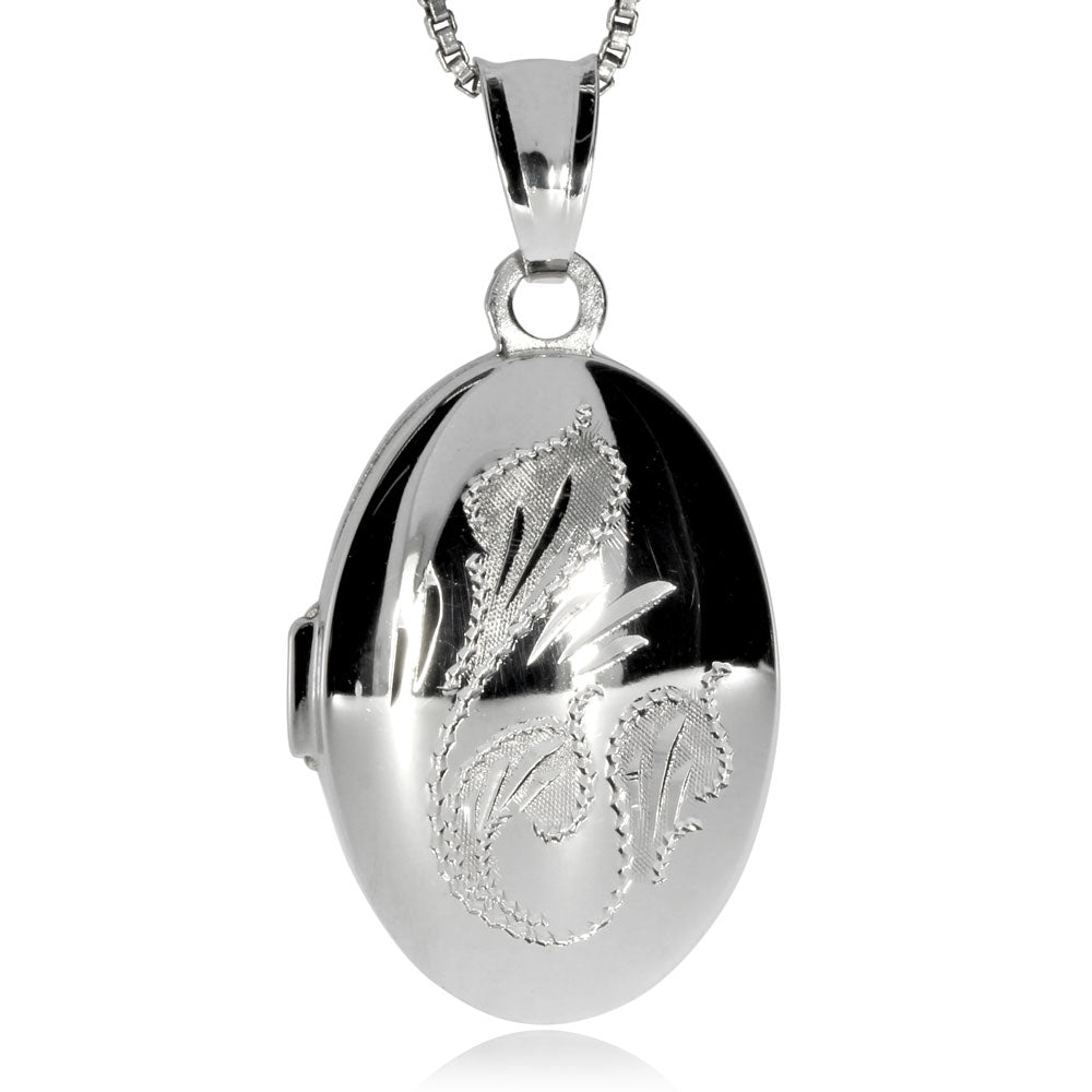 Stříbrný přívěsek má oválný tvar a přední straně otvírací části je ozdoben drobnou rytinou s květinovým motivem. Medailon je povrchově rhodiovaný ve vysokém lesku. Pevný leštěný úchyt přívěsku je dostatečně velký í na silnější návlek. Vnitřek medalonu je uzpůsoben ke snadnému uchycení fotografie.