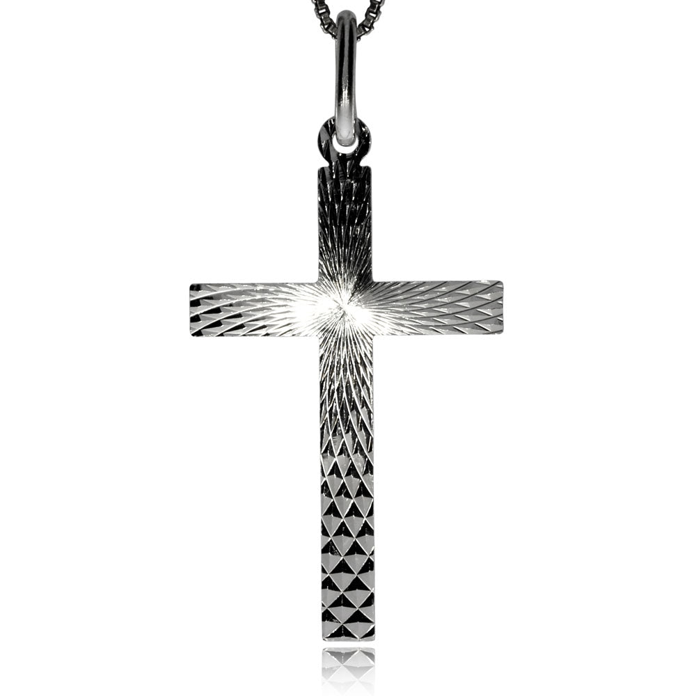 Elegantní přívěsek křesťanského křížku střední velikosti, který se svým zpracováním hodí pro muže i ženy. Přívěsek je vyrobený z kvalitního stříbra, které je potažené vrstvou odolného a vysoce lesklého rhodia. Jemné výbrusy na povrchu navíc kříži propůjčují elegantní třpyt.