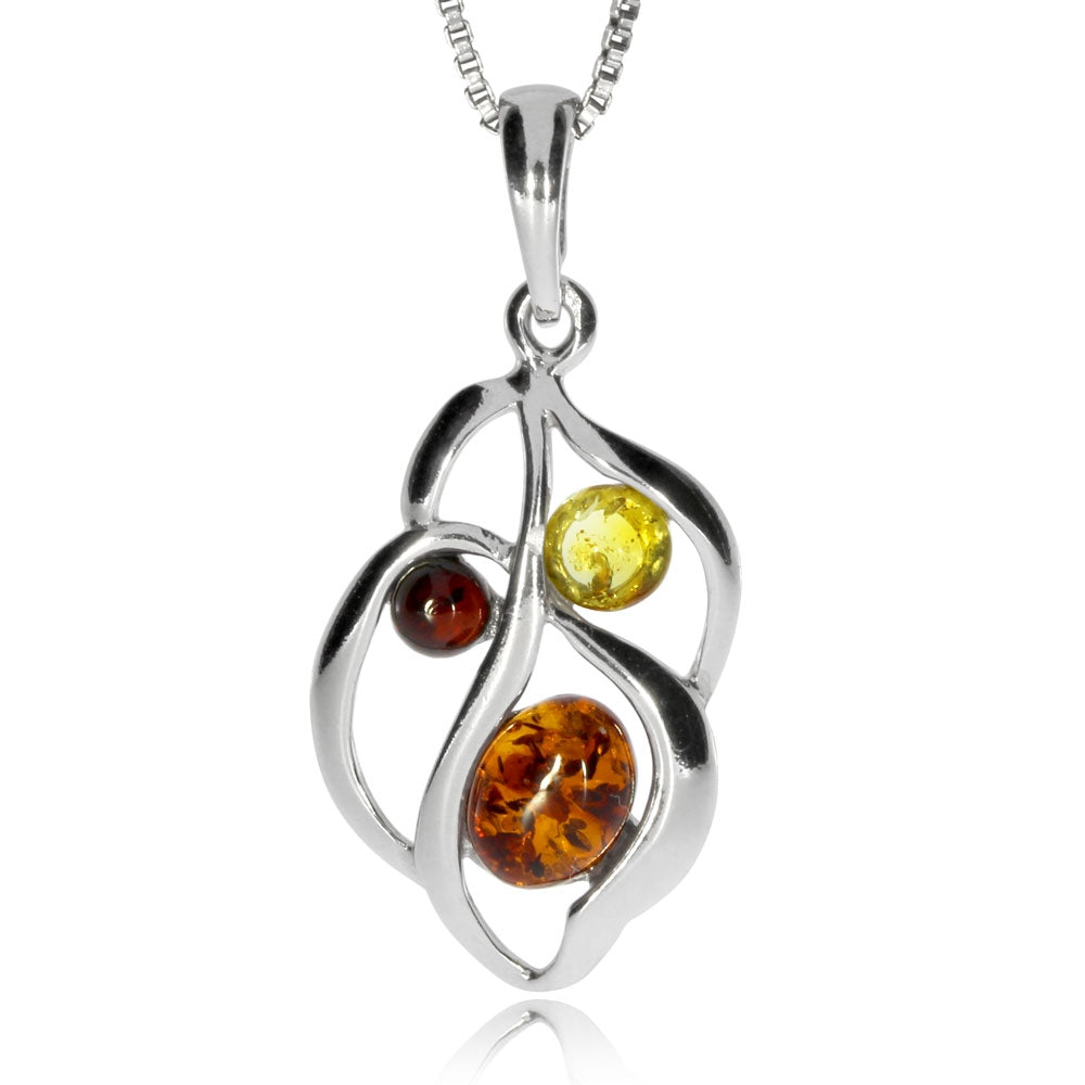 Jemný stříbrný přívěsek s motivem stylizovaného listu je ozdoben třemi oblými kameny baltského jantaru různých barev. Přívěsek je vyroben ze stříbra o ryzosti 925/1000, které je na povrchu pokryto lesklým rhodiem. Tento dámský šperk byl vyroben v Polsku.