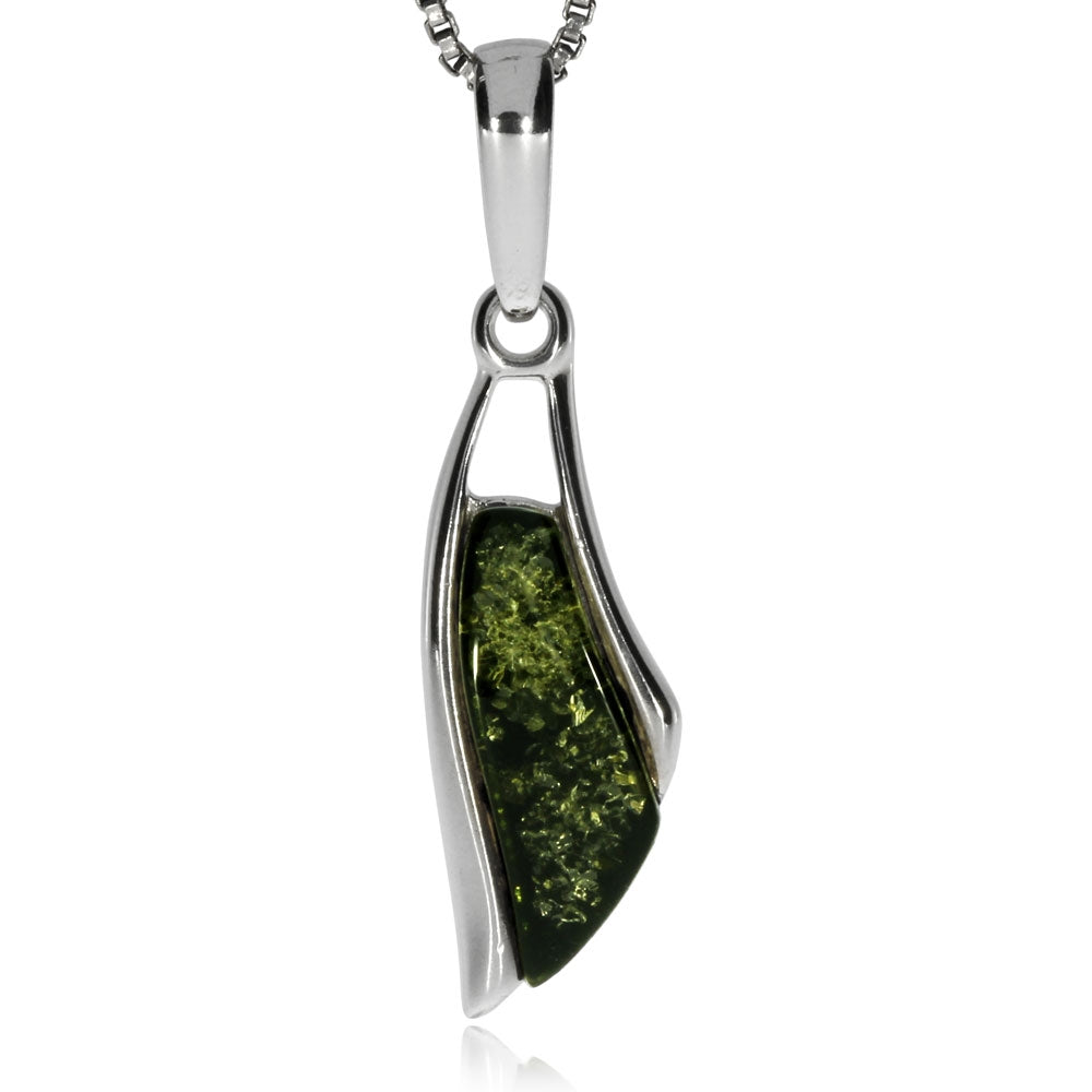 Drobný a půvabně zpracovaný dámský přívěsek, který nese kousek nazelenalého jantaru, poměrně vzácného organického materiálu, který je pro výrobu šperků oblíbený už od dávných dob. Jeho specifická vnitřní struktura je doplněná stříbrným povrchem, do kterého je jantar zasazený.