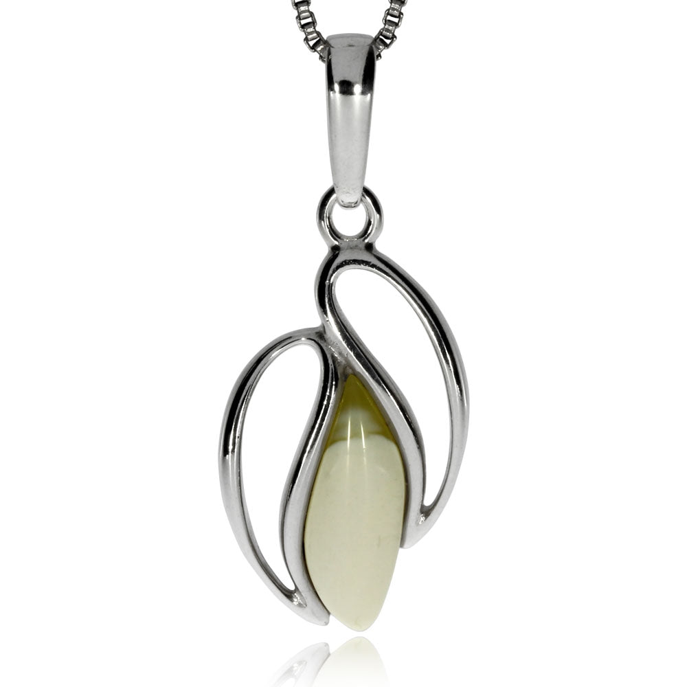 Jemně zpracovaný dámský stříbrný přívěsek zaujme svým nápaditým designem, kterému vévodí bělostný jantar s nažloutlými průlesky. Ten zdobí dvě elegantní stříbrná oka a vzniká tak zajímavý kontrast všech tří částí.