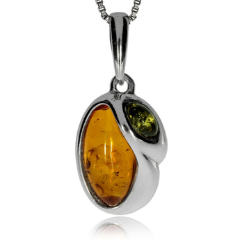 Originálně zpracovaný dámský přívěsek v sobě spojuje jemnost a nápaditý design. Přívěsek je vyrobený ze zářivého rhodiovaného stříbra, které se krásně leskne. Do něj jsou zasazené dva kousky jantaru ve zlaté a zelené barvě.