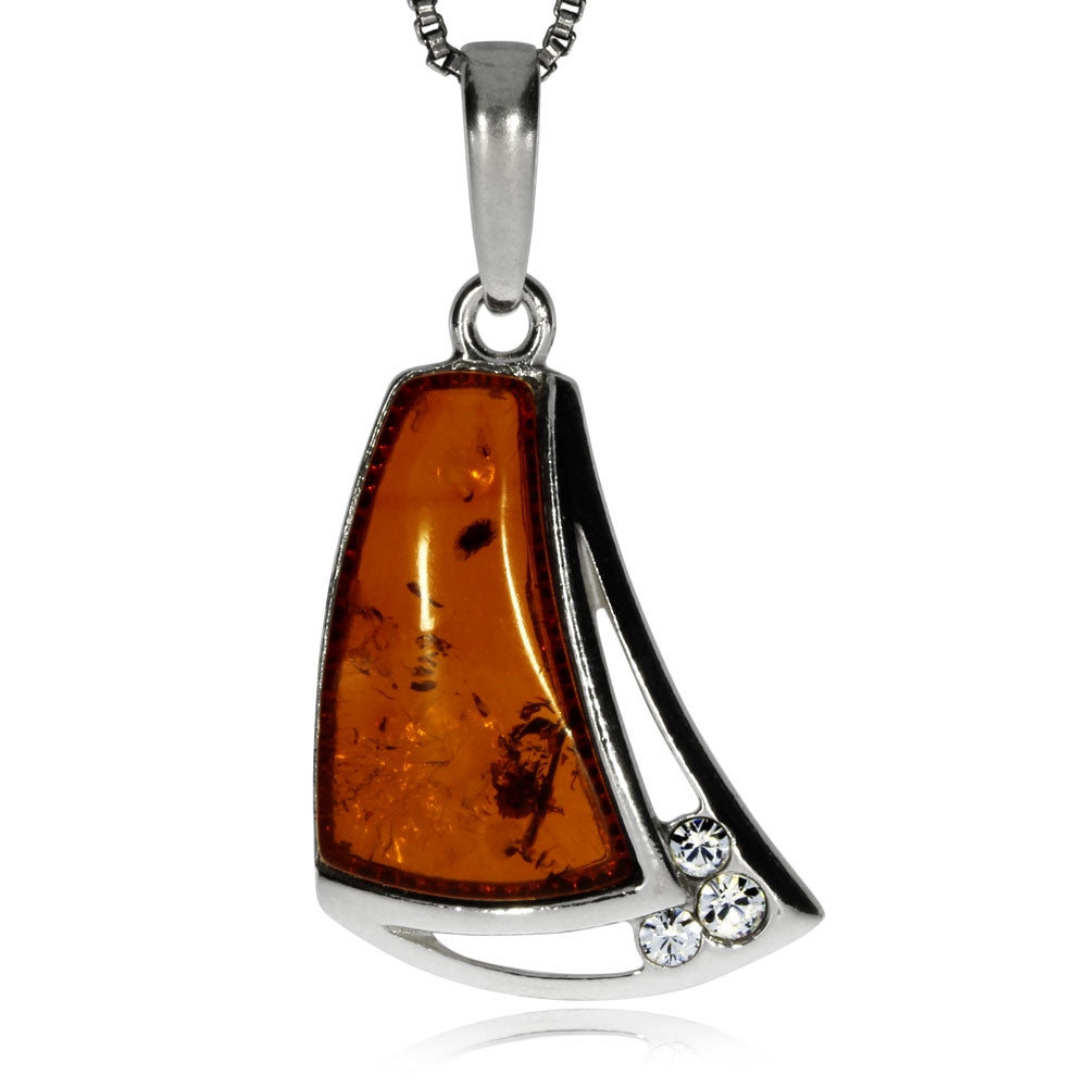 Netradiční a velice zajímavý dámský přívěsek v sobě spojuje několik různorodých prvků, které vytvářejí šperk s jedinečným půvabem. Přívěsek vyrobený z leštěného stříbra nese zasazený zlatavý kousek přírodního jantaru a tři čiré kousky křišťálu, které se nádherně třpytí.