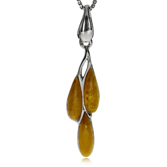 Velice nápaditý a krásně zpracovaný dámský přívěsek, který okouzlí svým neobyčejným designem a pozoruhodnou kombinací materiálů. Vyrobený je ze zářivého leštěného stříbra a zdobí ho tři kousky žlutého jantaru ve tvaru kapky.