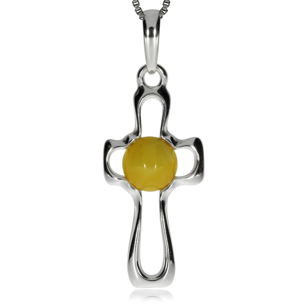 Originálně zpracovaný dámský přívěsek ve tvaru kříže, odvěkého symbolu víry a naděje, který zaujme svým netradičním designem a nápaditostí. Přívěsek je vyrobený z leštěného stříbra a ne středu nese zasazený žlutý půlkulatý jantar. Přívěsek skvěle vynikne s dalšími jantarovými šperky.