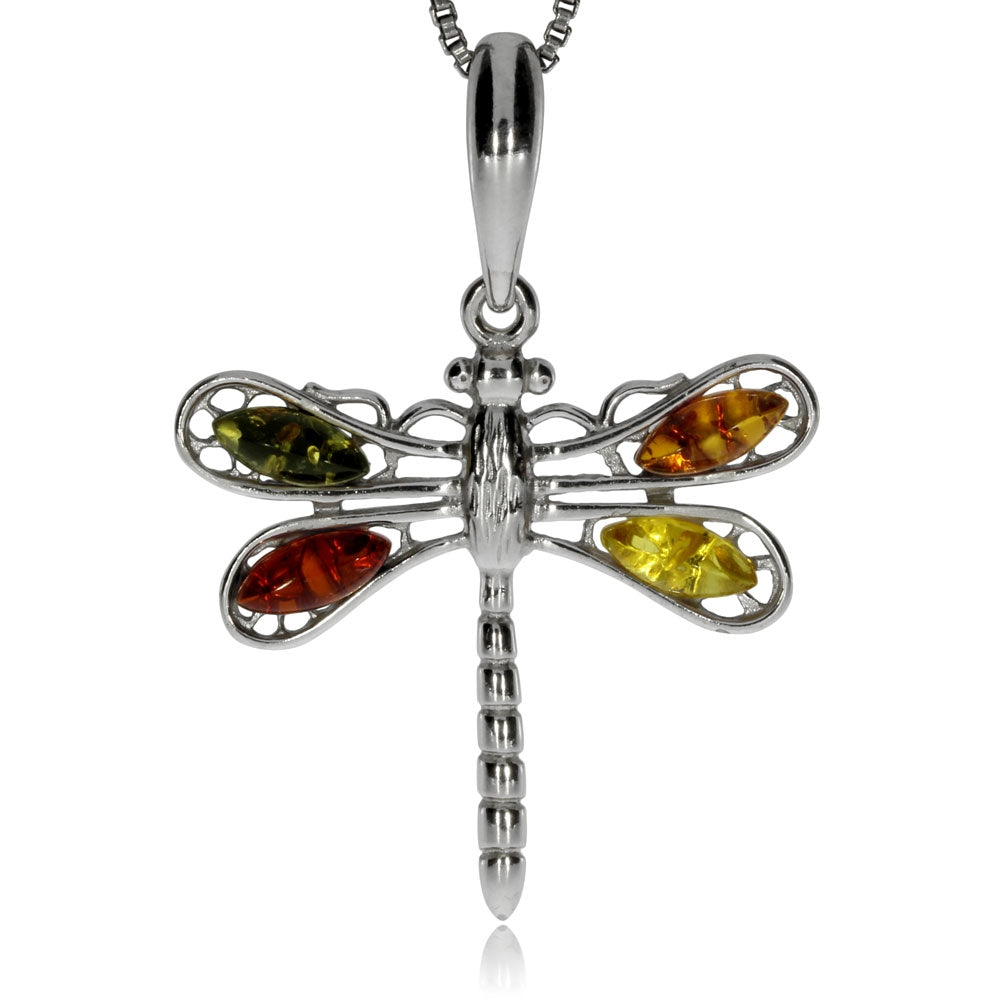 Stříbrný přívěsek s jantarem různých barev - Vážka