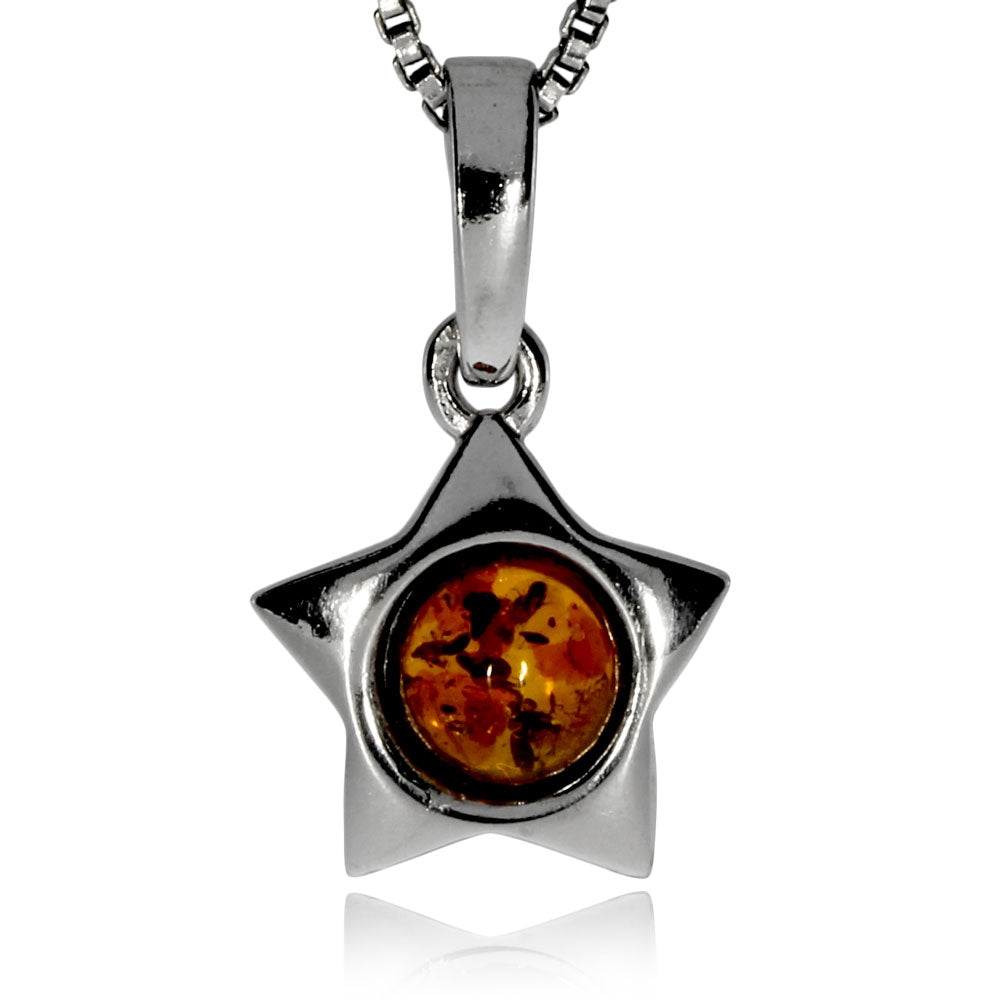 Okouzlující dámský přívěsek s romantickým motivem, který bude slušet ke každé příležitosti. Poměrně drobný přívěsek nese motiv pěticípé hvězdy a spojuje v sobě zářivé rhodiovaného stříbro a zlatavou barvu přírodního jantaru, kterým je osazený.
