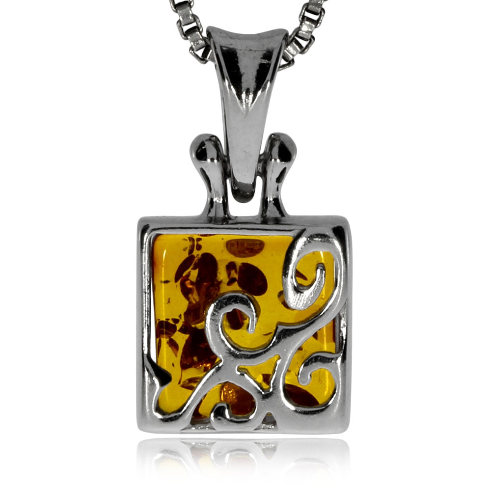 Stříbrný přívěsek s jantarem - Kámen ve tvaru čtverce zdobený zavinutými liniemi