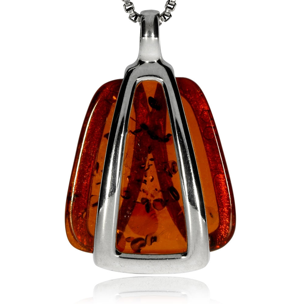 Nápaditý dámský přívěsek, který bude působivou ozdobou pro každou příležitost i pro každodenní nošení. Ústředním prvkem přívěsku je hnědý přírodní jantar, který nesou dvě zářivé linie lesklého rhodiovaného stříbra. To je oblíbené pro svou dobrou odolnost a skutečnost, že nezčerná.