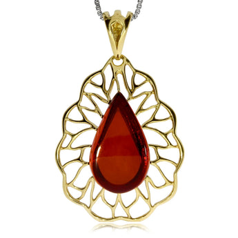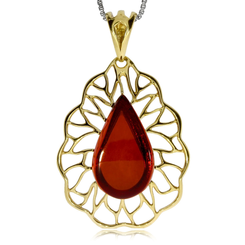 Stříbrný pozlacený přívěsek - Hnědá jantarová kapka v krajkové obrubě