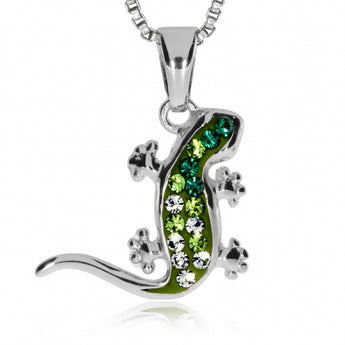 Drobný stříbrný přívěsek, který může přinést velkou radost. Šperk je vyroben z rhodiovaného stříbra a tělo ještěrky je ozdobené kulatými broušenými krystaly Swarovski zelené a čiré barvy. Přívěsek má lesklý jednoduchý úchyt.