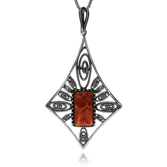 Nádherně a velice nápaditě zpracovaný dámský přívěsek, který svým designem i použitými materiály působí, jako by pocházel z minulého století. Jemně zdobený šperk doplňuje osazení červeným přírodním korálem obdélníkového tvaru.