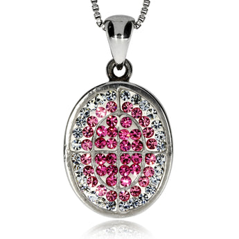 Nepříliš velký dámský stříbrný přívěsek s jemným dívčím půvabem, který se skvěle hodí k současným módním trendům i elegantnímu oblečení. Přívěsek oválného tvaru je osázený drobnými kulatými křišťálky, v čiré barvě po obvodu a ve dvou odstínech růžové směrem ke středu. Vzniká tak zajímavý efekt plný třpytu.