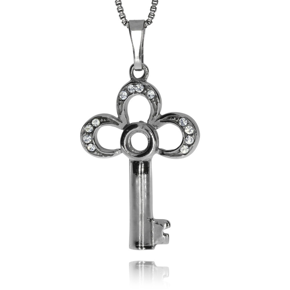 Zajímavý stříbrný přívěsek ve tvaru klíčku je ozdoben broušeným sklem. Klíč (k srdci) může být výmluvným dárkem pro někoho blízkého. Klíček je lesklý, povrhově upravený rhodiem.