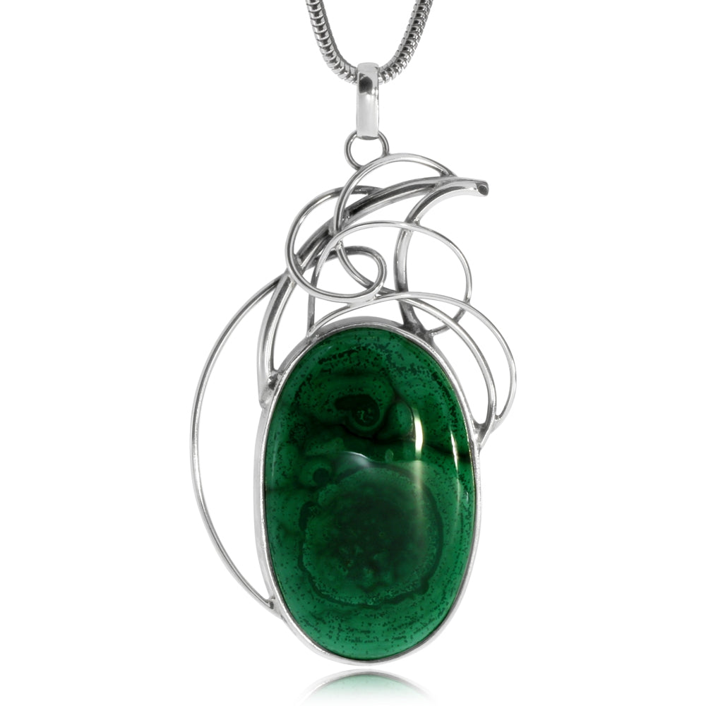 Větší stříbrný přívěsek s oválným malachitovým kamenem, který je vyleštěn a vyniká tak jeho působivá kresba. Přívěsek je kombinací klasického tvaru kamene a zcela nekonformního designu přívěsku. Vznikl tak šperk, který je zcela nepřehlédnutelným doplňkem oblečení. Je velmi vhodný pro ženy, které si zakládají na osobitých a neopakovatelných špercích.