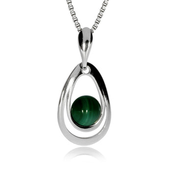Drobný stříbrný přívěsek vytvořený ze zdvojených linií kapky nese malý kulatý kabošon přírodního malachitu. Lesklé rhodiované stříbro pěkně kontrastuje s úchvatnou zelenou barvou leštěného malachitu. Takový přívěsek se pěkně vyjímá jak na pokožce. tak na jednobarevné látce oděvu. Lehoučký přívěsek může být zavěšen i na velmi tenký řetízek a bude tak vyhovovat ženám, které dávají přednost jemným šperkům.