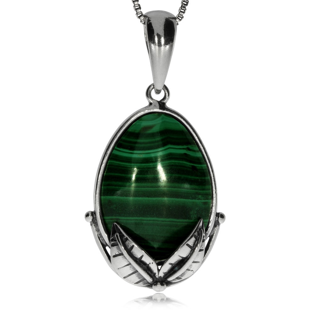 Originálně zpracovaný dámský přívěsek, kterému vévodí přírodní zelený polodrahokam malachit. Přívěsek je vyrobený z kvalitního stříbra ve starostříbrné úpravě, které tvoří jednoduché kovové lůžko a ozdobné lístky.