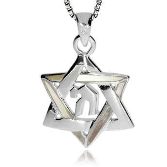 Stříbrný přívěsek ve tvaru Davidovy hvězdy se symbolem chai je vyložen bílou perletí. Výška přívěsku včetně jednoduchého očka dosahuje téměř 2,7 cm a očko je dostatečně velké i na silnější řetízek. Šperk je zajímavý propletením dvou trojúhelníků, které tvoří Davidovu hvězdu. Jeden z nich je z hladkého leštěného stříbra, zatímco ramena druhého jsou vyložena bílou perletí.