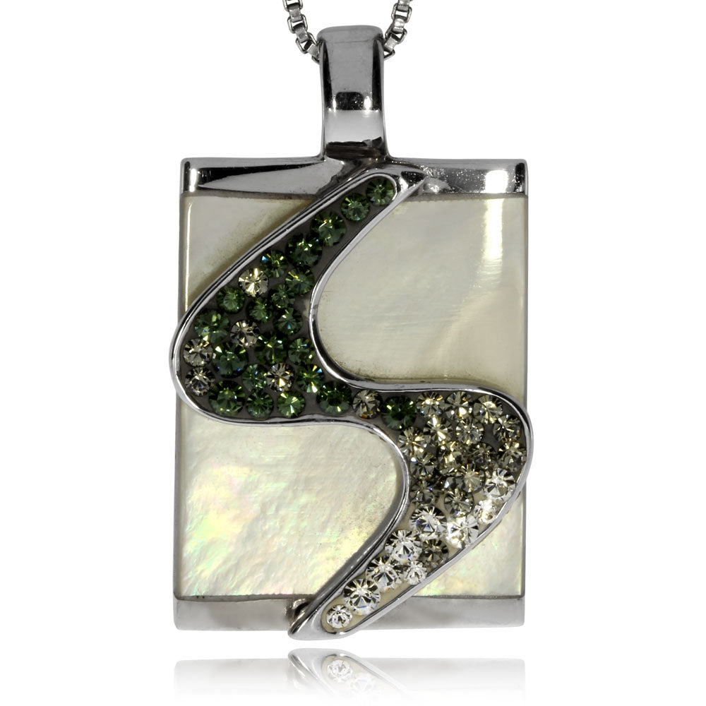 Nádherně zpracovaný a elegantní stříbrný přívěsek ve tvaru obdélníku je ozdobený jemnou středovou ozdobou, posetou drobnými křišťály. Ty přecházejí od čiré barvy, přes šedou, až po černou. Vzniká tak přechodový efekt, který vytváří zajimavý detail a kontrast s hladkou plochou přívěsku.