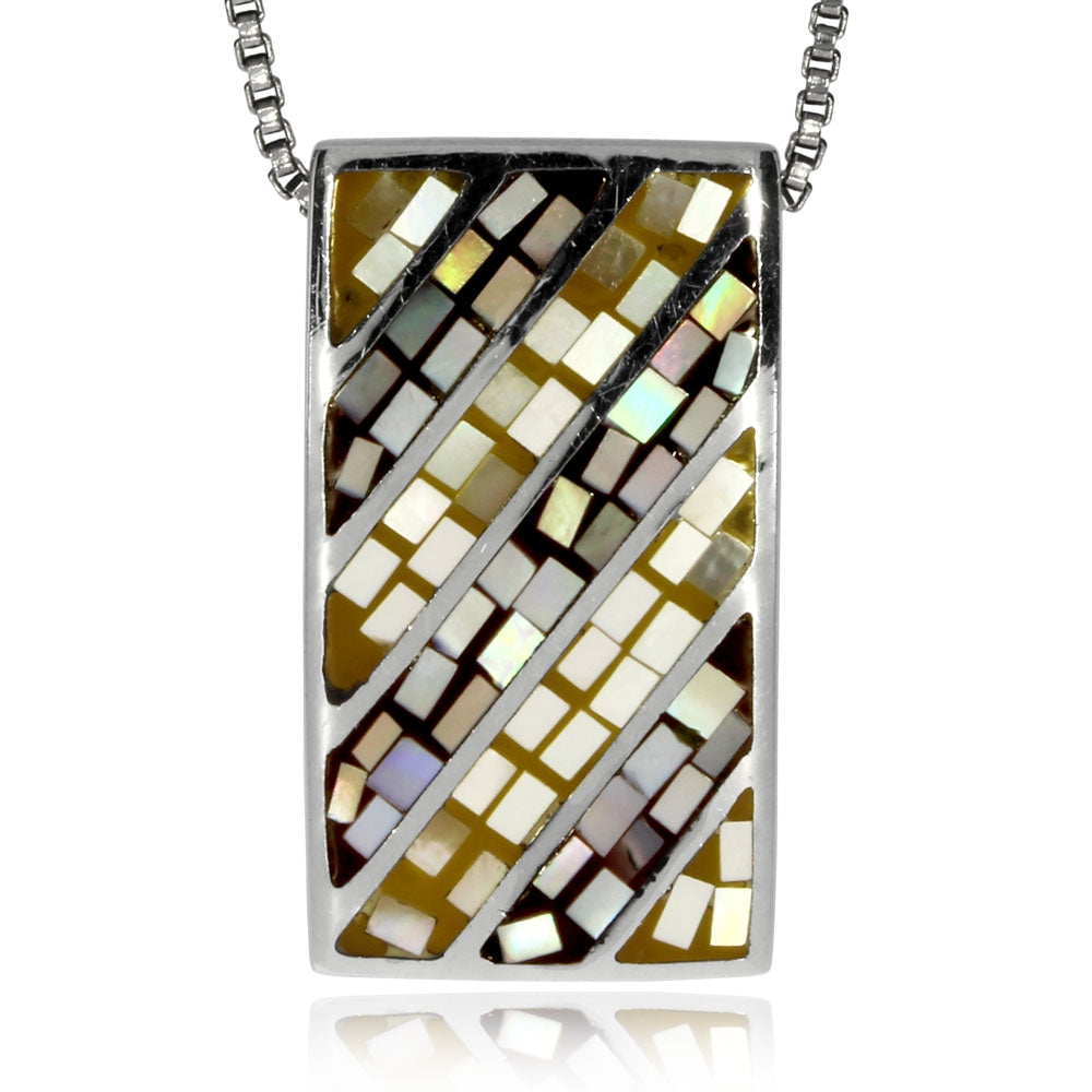 Originálně zpracovaný stříbrný dámský přívěsek v obdélníkovém tvaru má přední plochu rozdělenou do dvoubarevných pruhů oddělených jemnou stříbrnou linkou. Celá je potom ozdobená drobnými kousky perleti, vzácného organického materiálu, který propůjčuje šperkům decentní a nápaditý půvab.