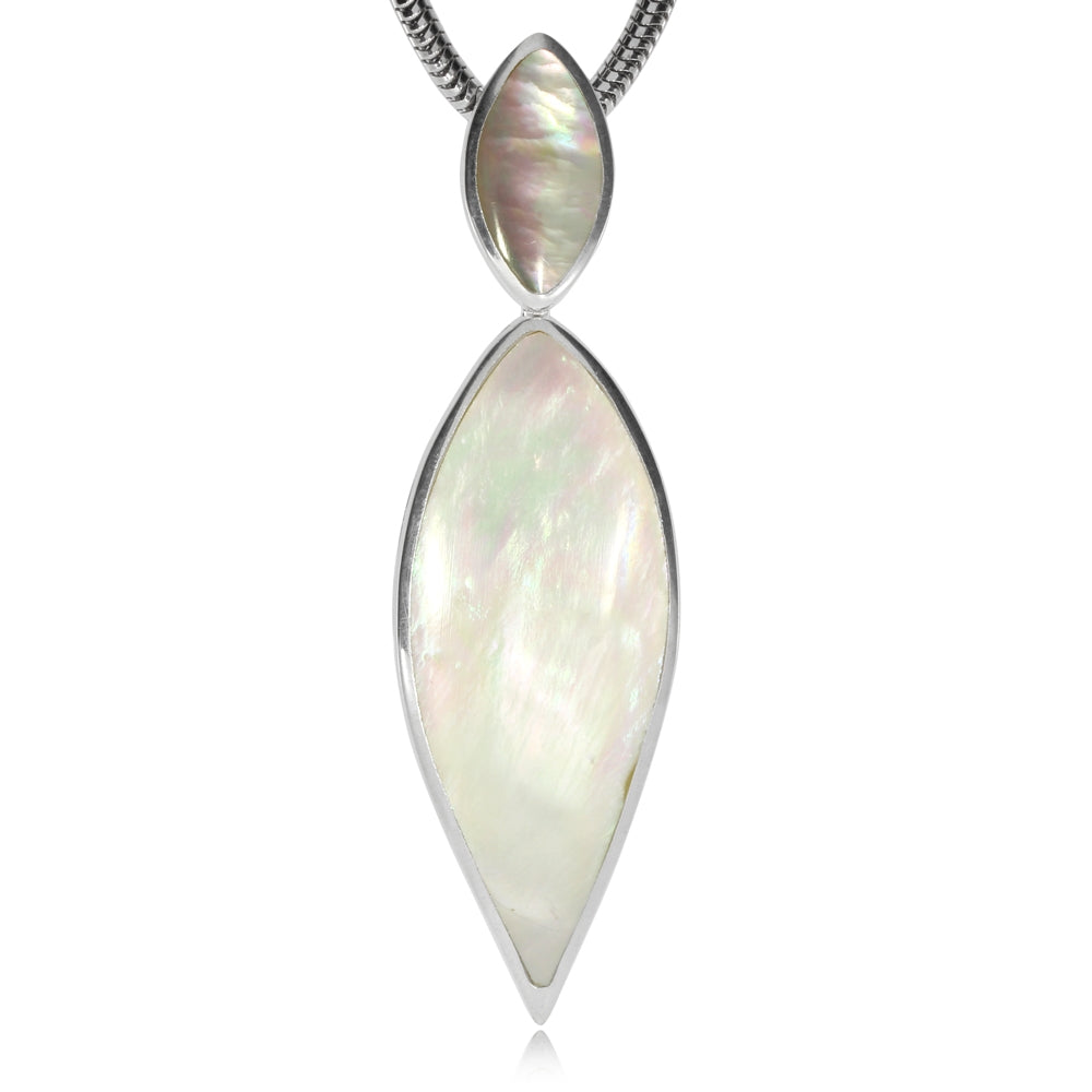 Stříbrný přívěsek s velmi výraznou bílou perletí má zajímavé řešení úchytu, který je rovněž ozdoben perletí. Obě části přívěsku jsou pohyblivě spojeny a řetízek se provlíká úchytem nenápadně. Na tmavém podkladu se přívěsek skvěle vyjímáí.