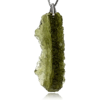 Vltavín je neobyčejný polodrahokam, který poutá pozornost svým magickým původem a osobitým půvabem, obzvlášť pokud je v neopracovaném stavu. Tento stříbrný přívěsek nese právě takový vltavín zelené barvy a bude skvělým netradičním šperkem.