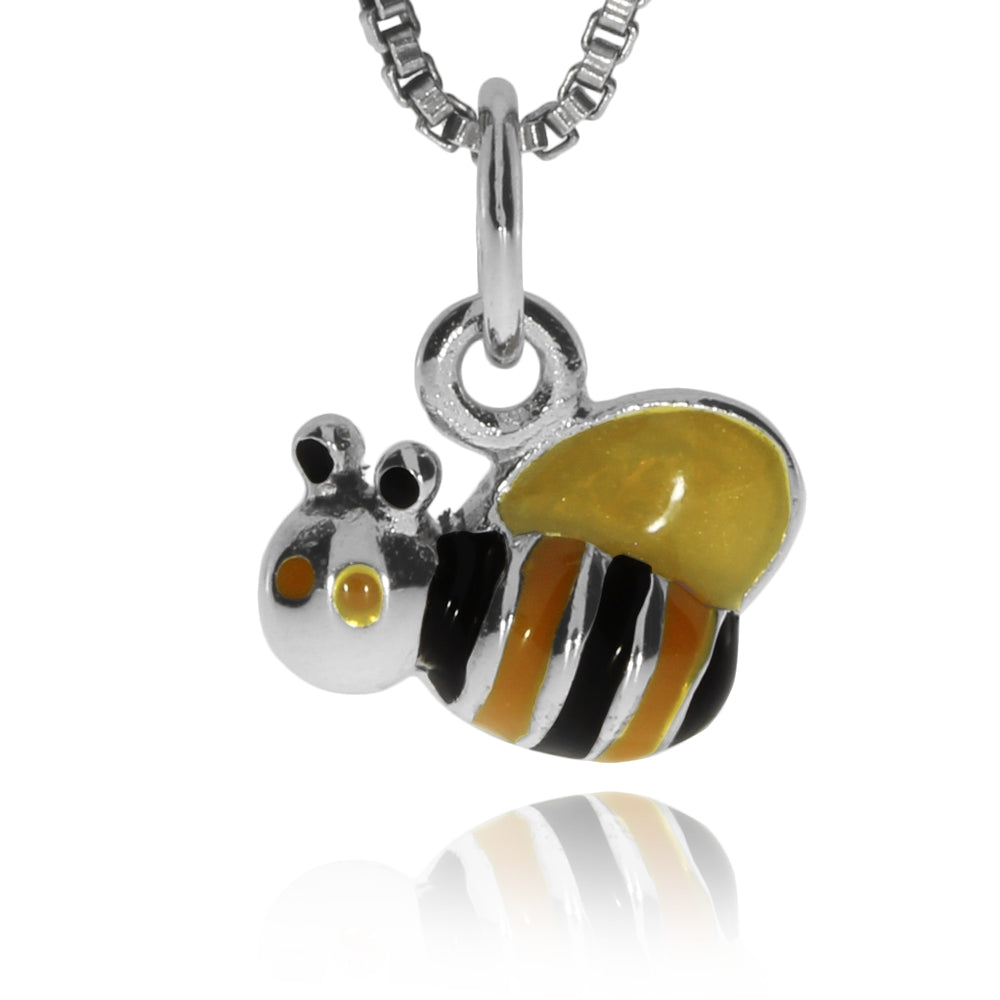 Nápaditý a velice hravý dětský přívěsek, který bude milým dárkem i ozdobou. Přívěsek je vyrobený z kvalitního a pěkně lesklého rhodiovaného stříbra, které zdobí smaltové plochy ve žluté, oranžové a černé barvě. Vzniká tak pěkný motiv včelky.