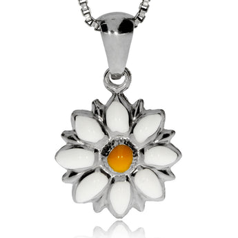 Malá kytička kopretiny jako přívěsek pro děti potěší svými pěknými barvami. Stříbrný úchyt a nebarevné části kytičky jsou rhodiované.