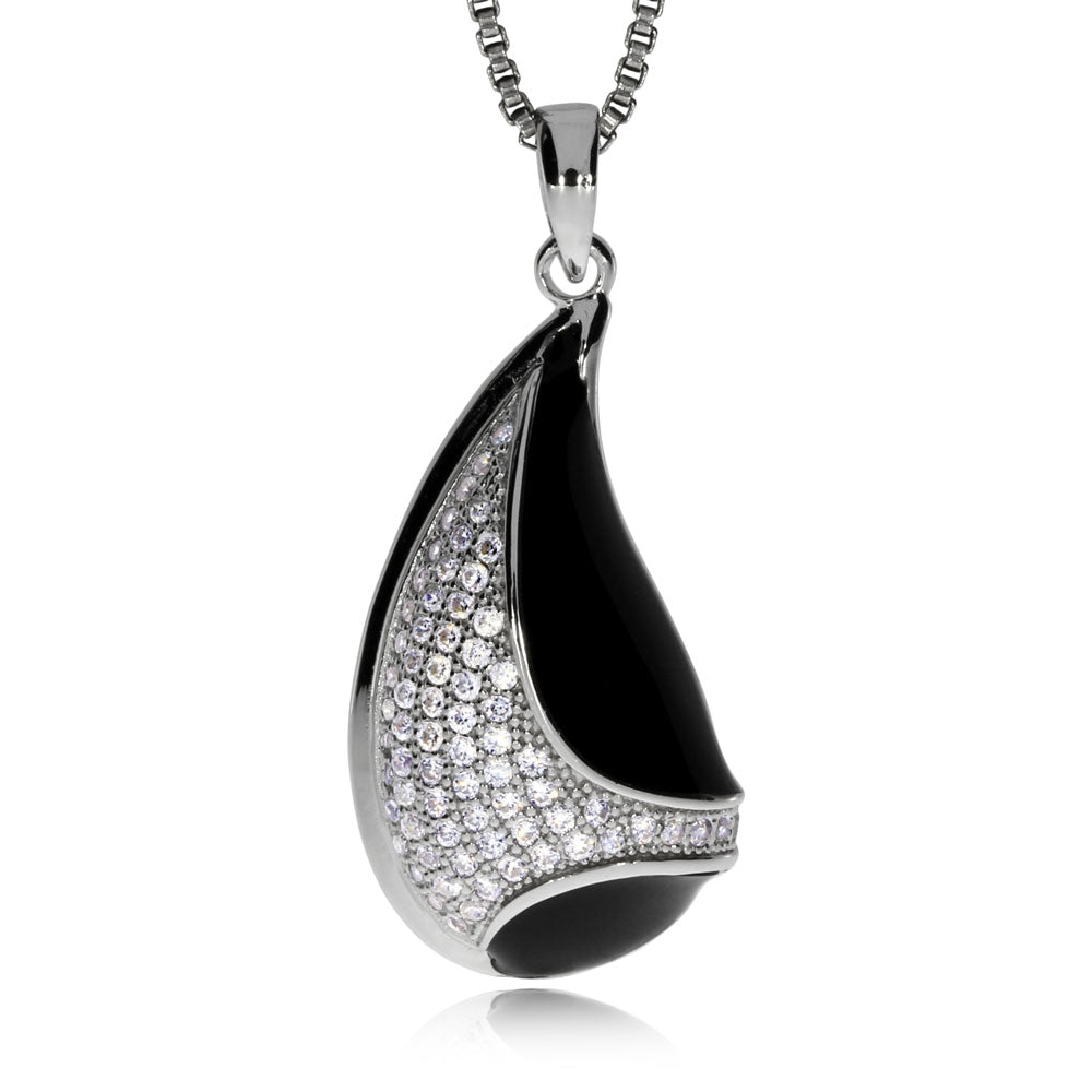 Nenechají vás v klidu originální a nápadité šperky plné elegance a luxusu? Pak jistě u tohoto přívěsku zpozorníte. Jednoduchý motiv ve tvaru kapky je velice pěkným způsobem ozdobený netradičním kontrastem. Ten vytváří zirkony (cubic zirconia) posetá, blyštivá plocha a černá plocha, které se v jednoduché linii vzájemně doplňují. Přívěsek je vyrobený z rhodiovaného stříbra, které je dobře odolné a krásně lesklé.