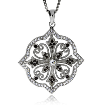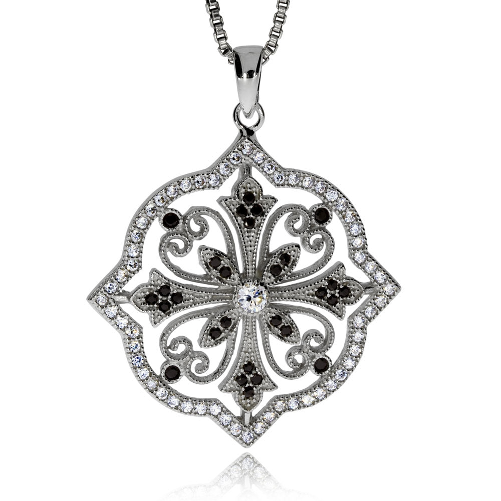 Zapůsobte jemným, elegantním a přesto nádherně zdobeným šperkem s decentním třpytem. Tento přívěsek s originálním motivem je vyrobený ze stříbra s rhodiovaným povrchem. To vyniká větší odolností a nebývalým leskem. Základem motivu je stejnoramenný kříž, někdy také nazývaný strom života, a ve středu má zasazený výrazný syntetický zirkon (cubic zirconia). Je doplněný mnoha kameny čiré i černé barvy a zdobnými liniemi, takže působí jako květina.