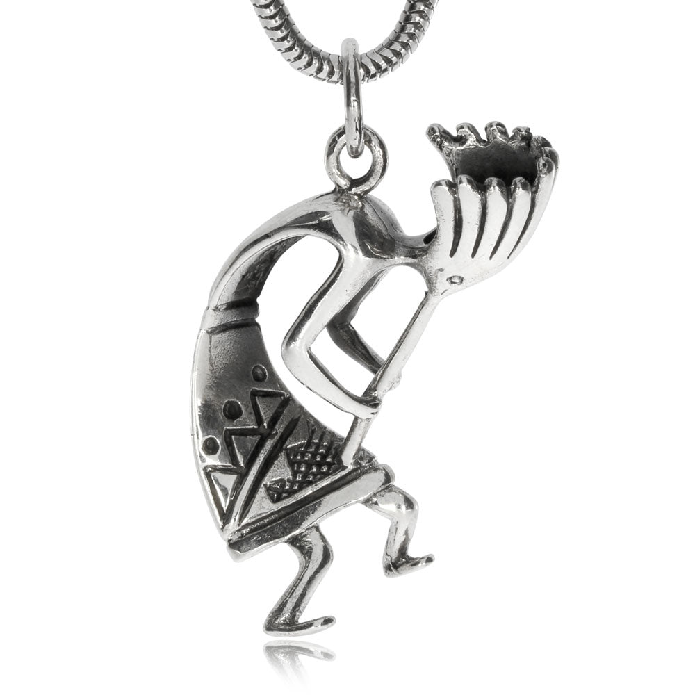 Stříbrný přívěsek s legendární postavou jihoamerických indiánských bájí - poutník Kokopeli hrající při tanci na píšťalu. Přinášel zajímavé zboží a novinky. Zmiňuje se i jeho schopnost přivolat hrou na flétnu blahodárný déšť. Proto byl ve vesnicích vítán a oslavován. Legendy zmiňují i jeho velkou náklonnost k ženám a to, že po jeho odchodu nebyla plodná jen orná půda... Stříbrný přívěsek s postavičkou Kokopeliho je velmi plastický a povrch stříbra je patinovaný.