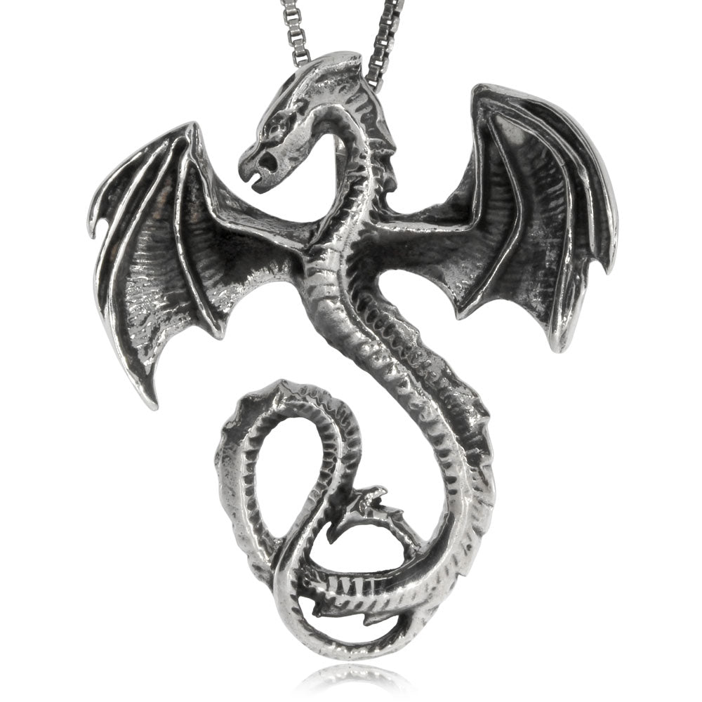 Patinovaný stříbrný přívěsek v podobě tenkého draka se zavinutým ocasem má vyváženou kompozici tvaru. Nápadná roztažená blanitá křídla upoutají pozornost stejně tak jako hlava draka, kterou prochází řetízek. Přívěsku velmi prospívá, že nemá žádné zvláštní očko na zavěšení, které by působilo rušivě. Přívěsek svojí velikostí patří k větším a je vhodný jak pro ženy tak pro muže.