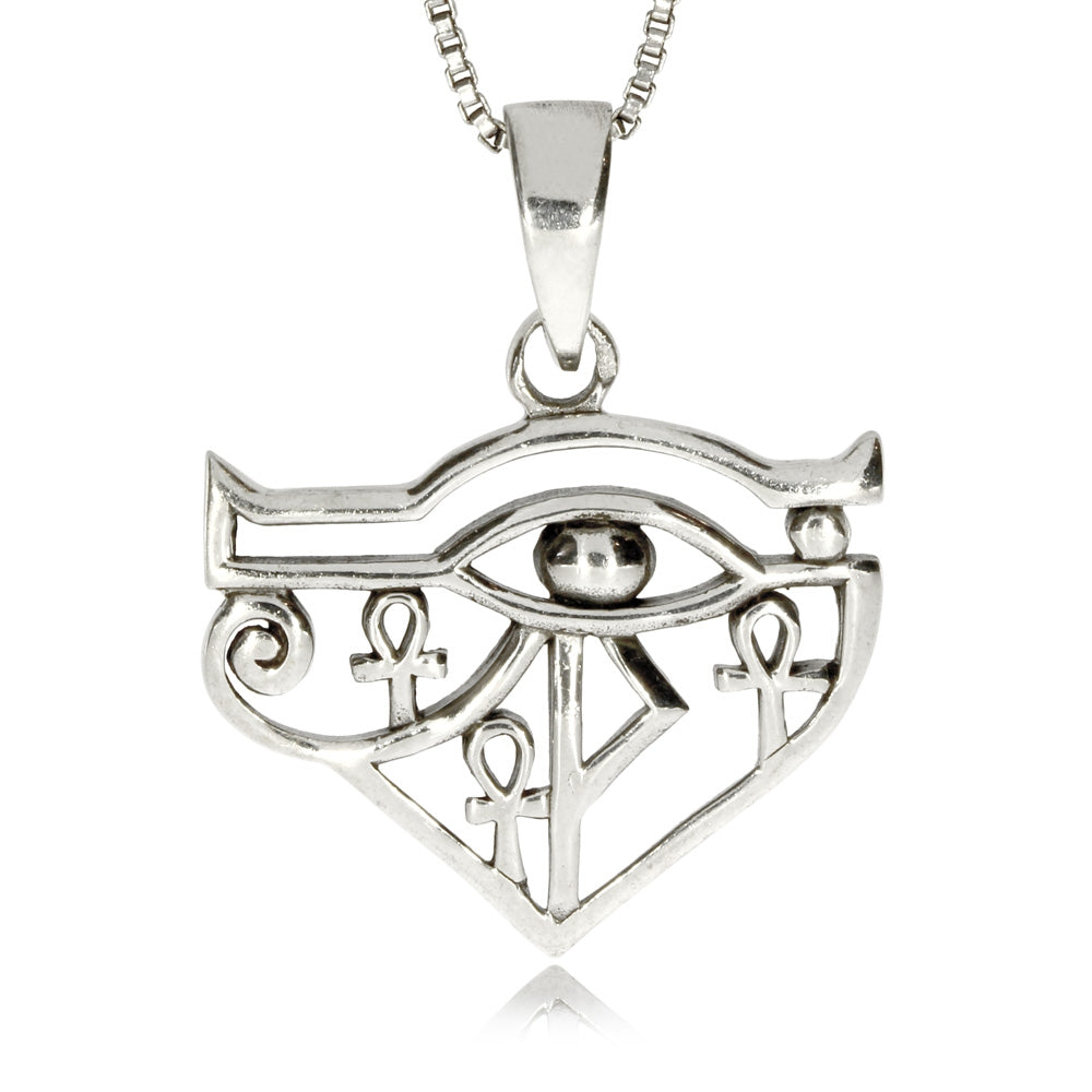Stříbrný přívěsek s egyptskou symbolikou spojuje silné ochranitelské znamení Horovo oko a kříže. Nilský kříž, nebo také ankh je známým egyptským hieroglifem, který znamená slovo život. Jeho význam byl i širší, znamenal i znovuzrození nebo nesmrtelnost. Tento stříbrný přívěsek je větší, ale lehký, protože je celý námět vykreslen ve stříbrných liniích. Šperk se tedy bude velmi pěkně vyjímat na tmavší látce oblečení.