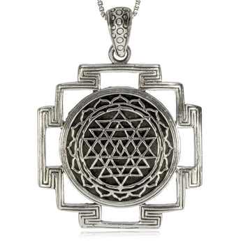 Stříbrný přívěsek ve tvaru mandaly Sri Yantra je sprituálním a rituálním symbolem v hinduistickém a budhistickém náboženství. Tento tvar čtvercový se čtyřmi \"branami\" představuje vesmír a vnitřní kruh je vyjádřením mikrokosmosu. Manadaly mají specifický symbolický význam. V Tibetu je velká obliba vytvářet mandaly z různobarevného písku. Sříbrný přívěsek ve tvaru mandaly je poměrně velký a těžký - hmotnost 12 gramů a je proto třeba doporučit silnější řetízek.
